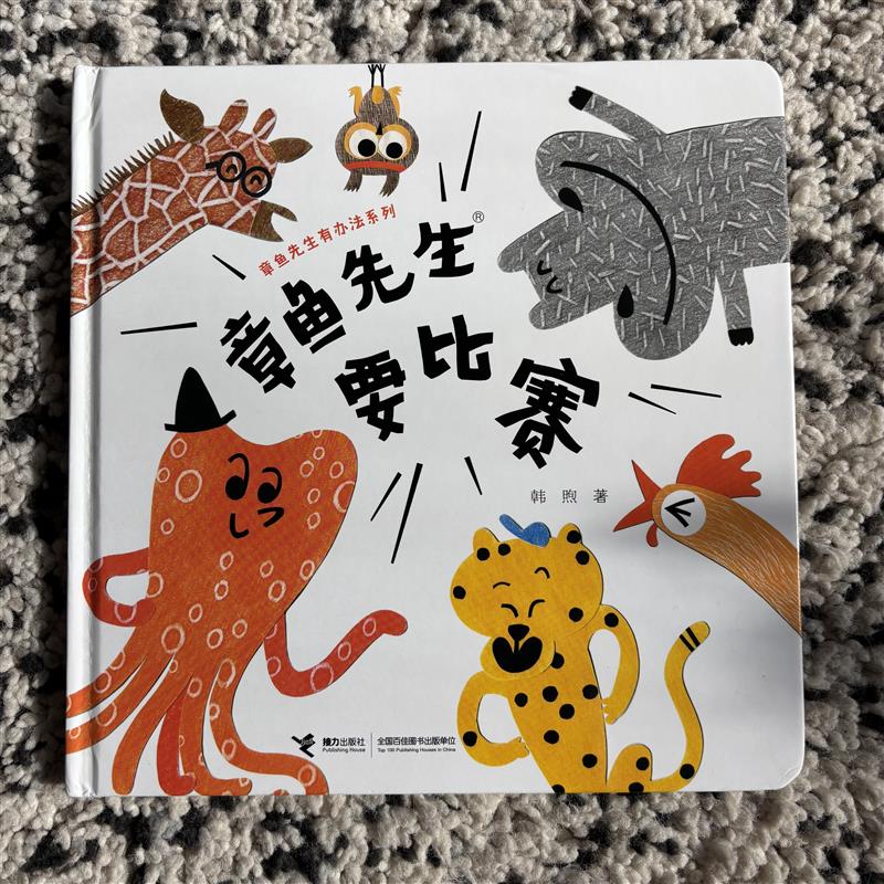 章鱼先生要比赛 [Mr. Octopus’s Competition] is a story about some animal friends competing in various events, such as who is the tallest, the fastest, or the loudest. The last page is a fun lift-the-flap where each animal gets a prize in their best event.