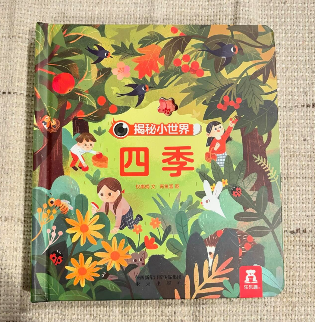 Along with this one, I also picked up 四季 [Four Seasons], a book that describes both how nature changes and what activities people might do throughout the year. Chinese books can be a bit agrarian, so many of the events that mark the seasons (watermelon ripening, ice in the brook melting) aren’t relatable for my kids, but others definitely are (going down a water slide, celebrating Christmas).